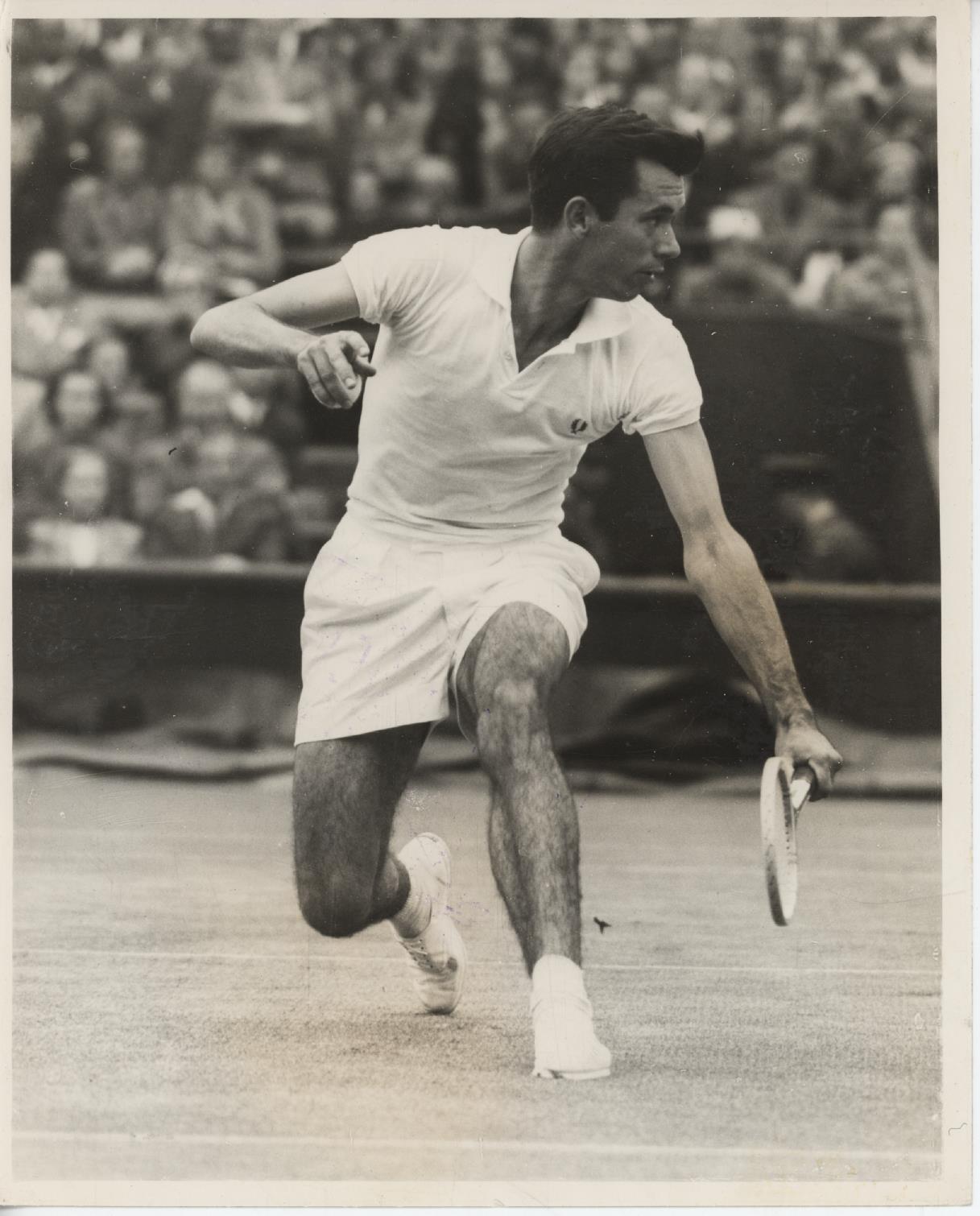 Original Press photograph of Mervyn Rose at Wimbledon during his Quarter final match v Tony Trabert in the Mens' singles