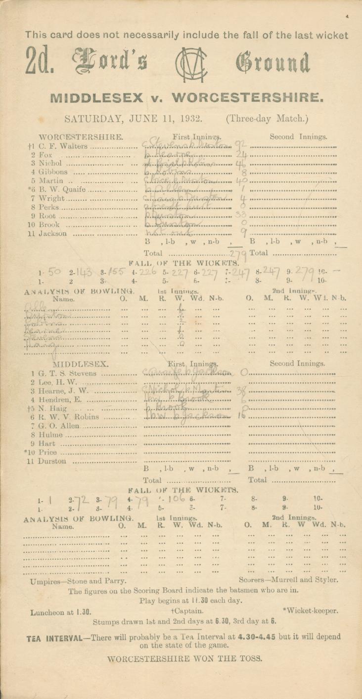Cricket » Cricket Scorecards » Middlesex » MIDDLESEX V WORCESTERSHIRE 1932 CRICKET SCORECARD