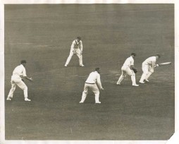 Original Press cricket photograph. Middlesex's Harry Lee plays a ball from Fairfax through the gulley with the Australian slips and keeper and forward short leg looking on. From the game played at Lord's on 4,5,6 June 1930. The Australians won by 5 wickets, Hornibrook taking 11 wickets in the match.