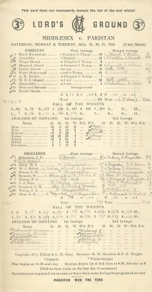 MIDDLESEX V PAKISTAN 1954 CRICKET SCORECARD