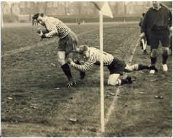 Black and white Press photograph of the game played at the Old Deer Park, Richmond, on 9 November 1955. PH Ryan, the Middlesex forward, is brought down just short of the line by PR Mills, the Surrey right wing. Central Press Photos Ltd, London.