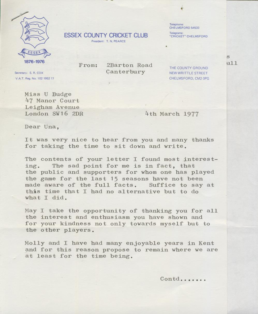 Typed letter on Essex CCC notepaper responding to the recipient's comment on his losing the Kent captaincy and leaving the county in 1977. '...the public and supporters... have not been made aware of the full facts.' Signed 'MIke'.