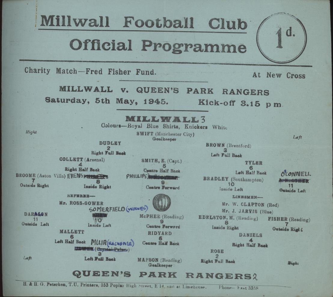 Football » Football Programmes » Testimonial & Charity Matches » MILLWALL V QUEEN'S PARK RANGERS 1944-45 FOOTBALL PROGRAMME (FRED FISHER FUND)