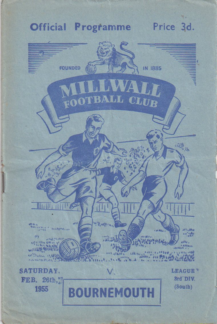 Official football match programme from the League Division 3 (South) match between Millwall and Bournemouth, played at The Den on the 26th of February 1955.