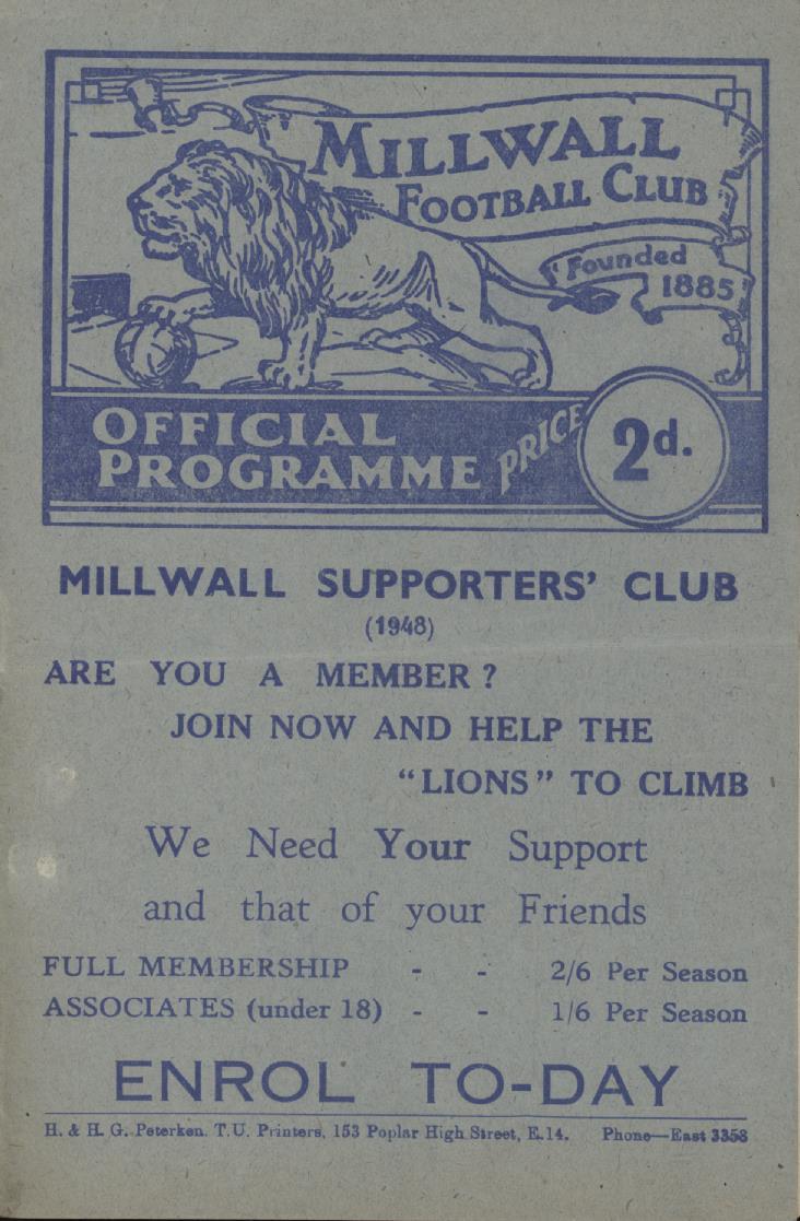 MILWALL V READING 1948-49 FOOTBALL PROGRAMME