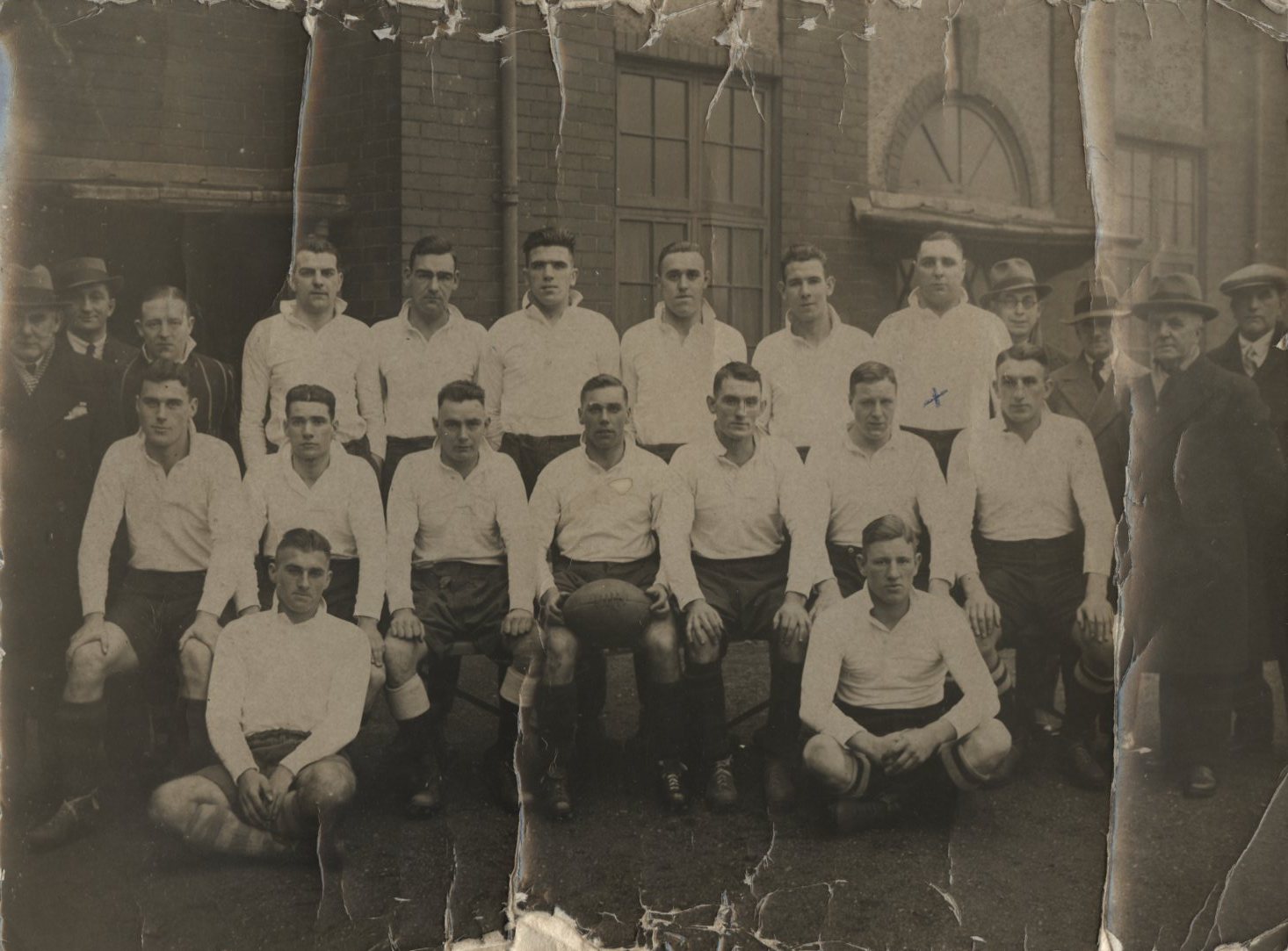 25 x 18.2cm. Sepia tinted photograph, photographer's stamp to reverse. Edges badly rubbed and torn, delaminating in places. Small areas of surface loss to the lower section of the photograph. Heavy fold to right hand edge. Cross in blue ink to centre left of front. In poor condition.