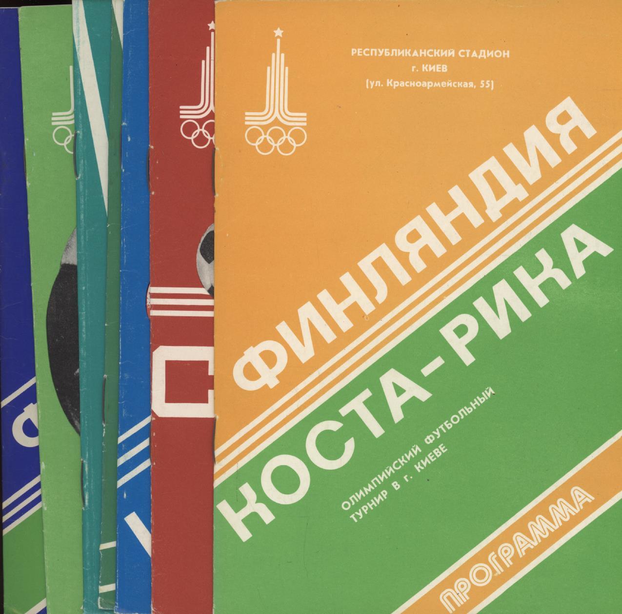 A set of seven football programmes from the Moscow Olympics of 1980, all matches played in Kyiv. Include Finland v Iraq, East Germany v Algeria, Costa Rica v Iraq, East Germany v Iraq, East Germany v Spain, Finland v Costa Rica and East Germany v Syria.