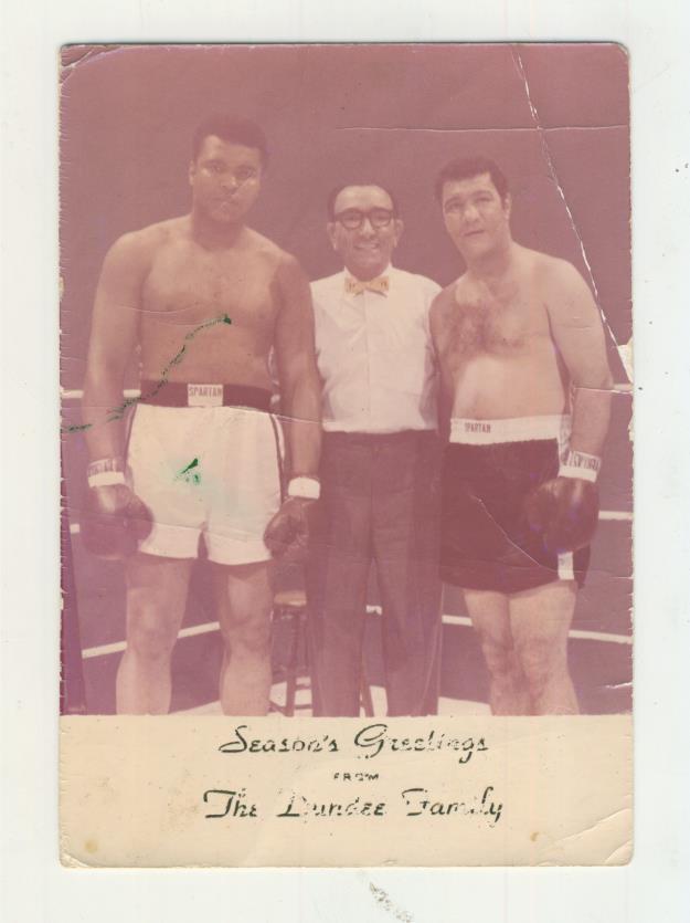 Boxing photograph of Muhammad Ali and Rocky Marciano standing alongside Chris Dundee during filming of "The Super Fight" in 1969. This was a fictional fight between the two great boxers which used footage of the two sparring together. Chris Dundee was the older brother of Ali's trainer Angelo, and was a well-known boxing promoter - he acted as the referee in the fight. This photo was printed by Dundee with the caption at the bottom -"Season's Greetings from The Dundee Family". Rocky Marciano died in a plane crash about one month after this photograph was taken.