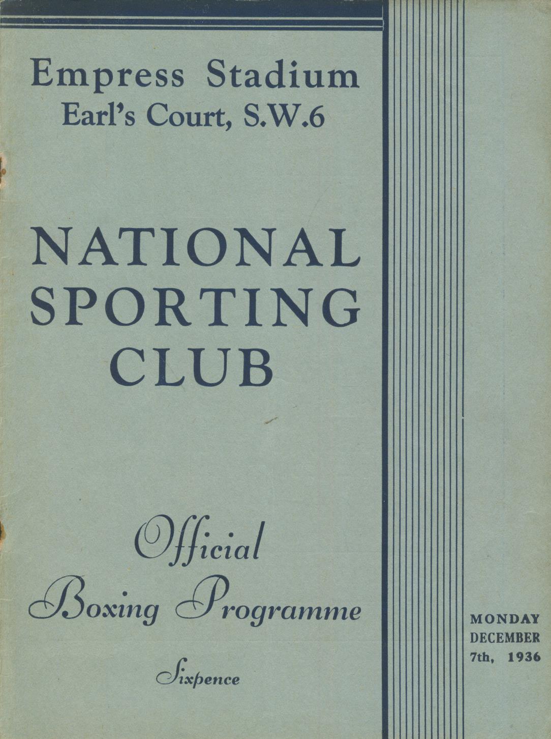 Official boxing programme for the bouts held at the Empress Stadium, Earl's Court, on December 7th, 1936. The bouts included Jimmy Walsh v George Daly and Benny Caplan v Cuthbert Taylor.