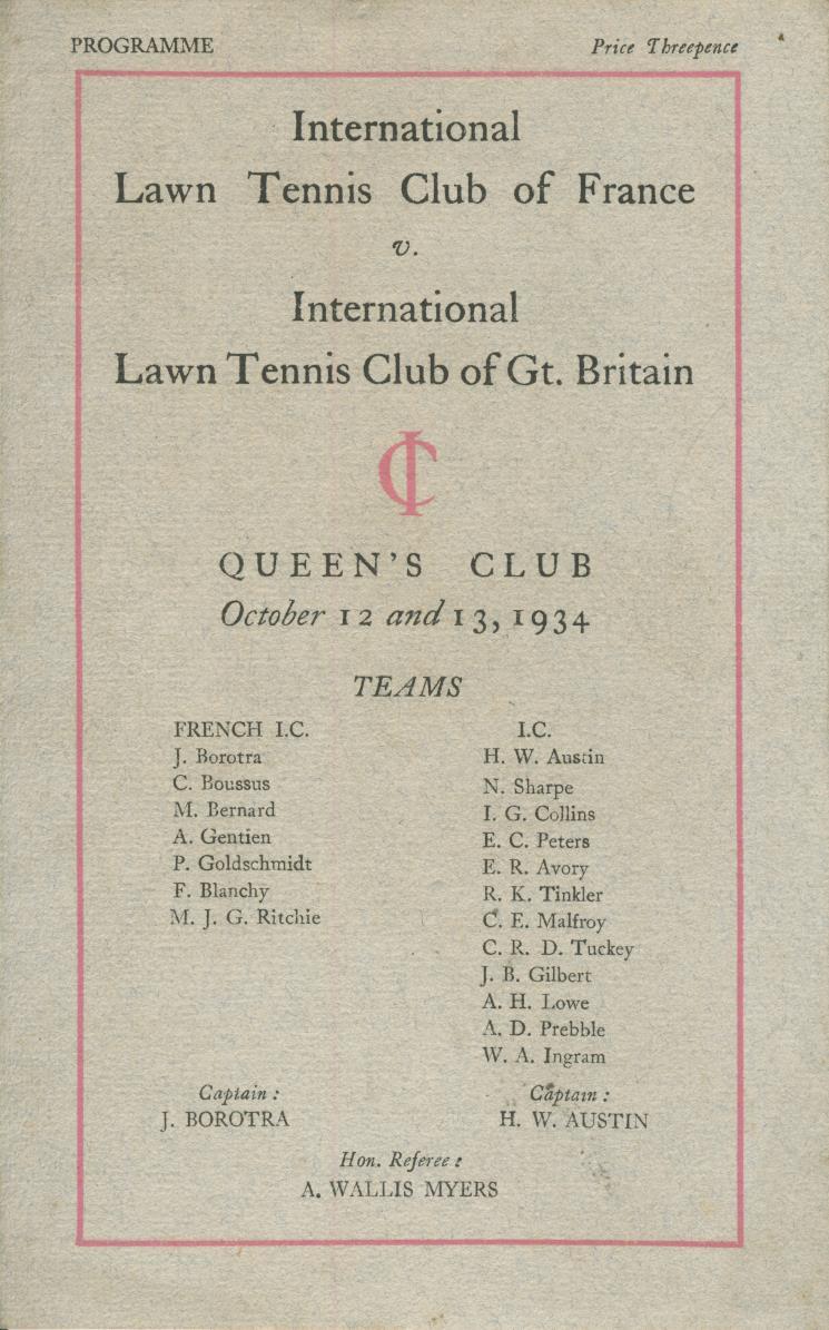 Official programme for the tennis match between the International Lawn Tennis Clubs of France and Great Britain, held at the Queen's Club on October 12 -13, 1934. The captains were Borotra and Austin.
