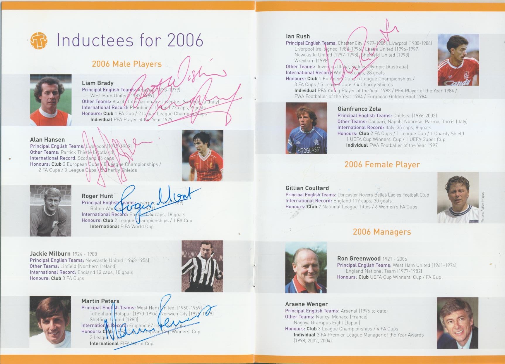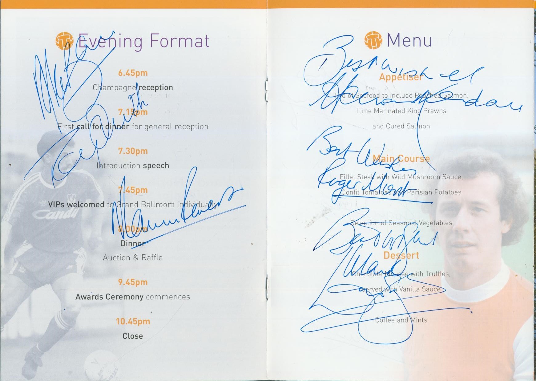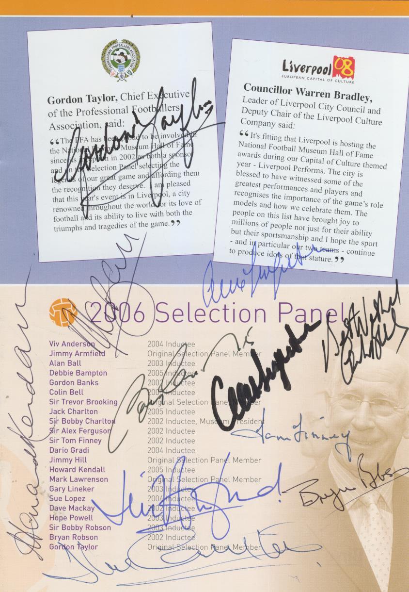 Dinner menu for the National Football Museum Hall of Fame awards ceremony, held at the Crowne Plaza Hotel, Liverpool, on October 19th 2006. Signed on the inside pages by at least 18 guests. These include Alan Ball (twice), Martin Peters (twice), Howard Kendall (twice), Roger Hunt (twice), Liam Brady, Ian Rush, Alex Ferguson (twice), Tom Finney, Gordon Taylor, Bobby Charlton, Jack Charlton, Jimmy Armfield, Bryan Robson and Alan Hansen.