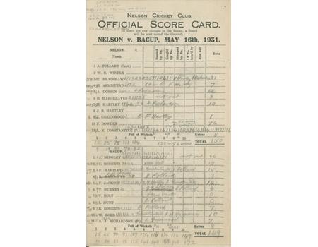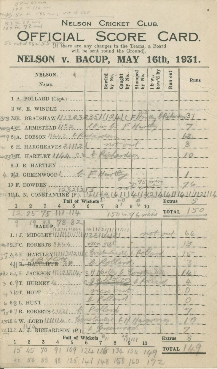 Offcial scorecard for the Lancashire League cricket match between Nelson and Bacup, played on May 16th, 1931. From the scores, recorded in pencil, it seems that Learie Constantine scored 76* in helping Nelson win by 5 wickets. All scores recorded in pencil. Very good condition.