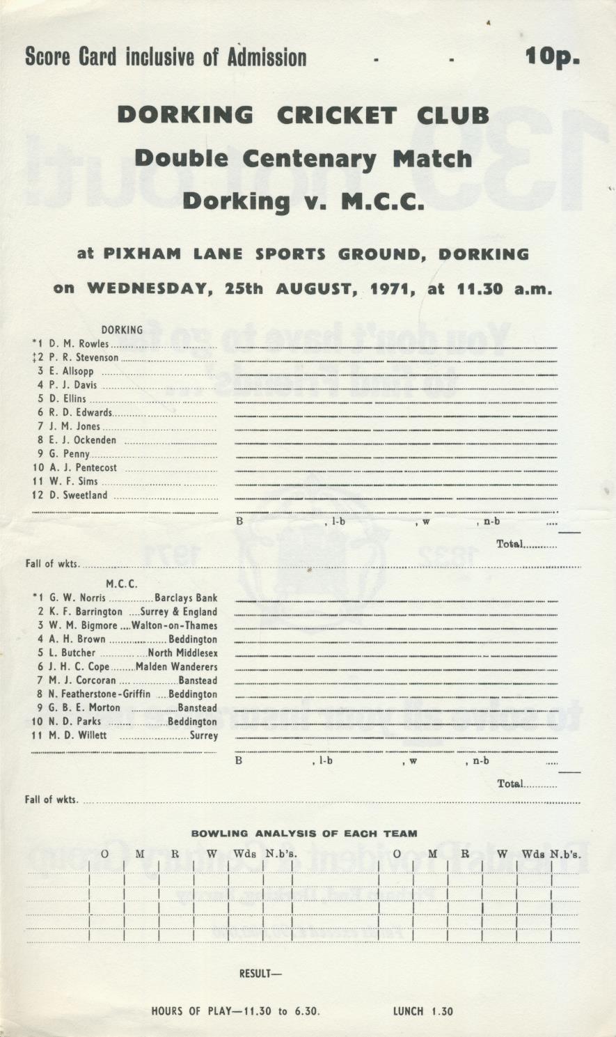 DORKING V M.C.C. 1971 CRICKET SCORECARD