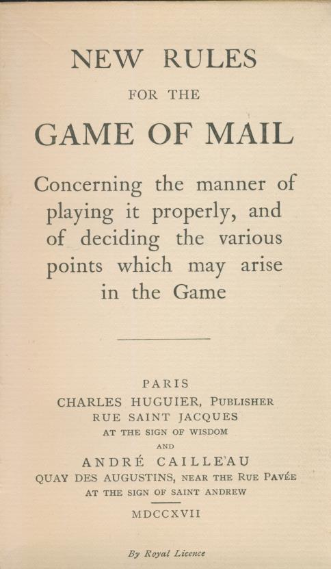 Translation of the book Jeu de Mail of 1717, attributed to Joseph Lauthier and translated by James Cunningham. Jeu de Mail was played in France and has close links to Croquet and Golf. Introduction by Andrew Lang.