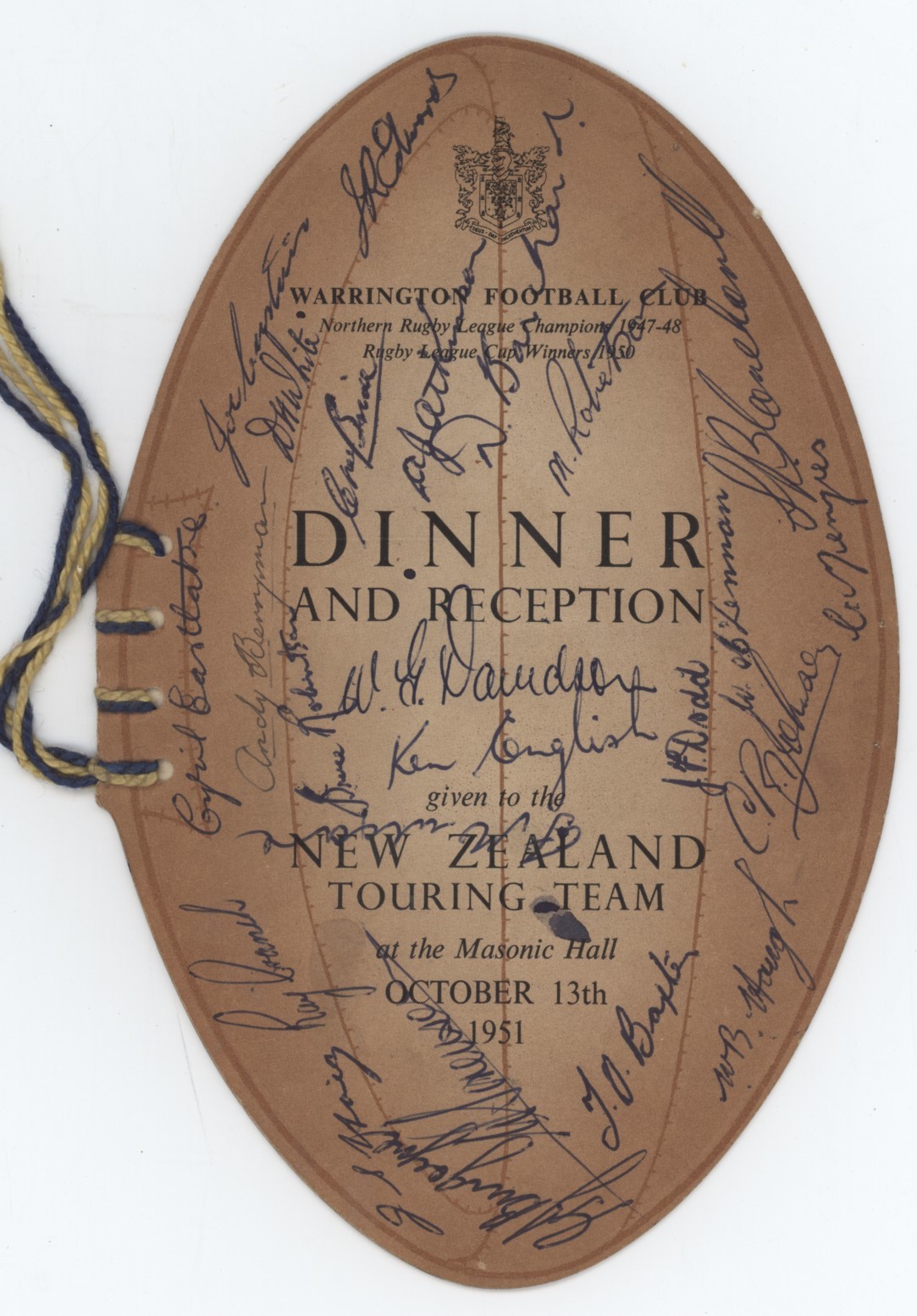 Menu card for a dinner held by Warrington RLFC in honour of the touring New Zealand team on October 13th, 1951. Earlier in the day The Kiwis defeated Warrington 19-13. Rugby ball shaped menu card, signed to the front in ink by at least 24 members of the touring party, including English, White, Robertson, Berryman, Eastlake, Davidson, Edwards, Atkinson, Barchard etc. Also signed to the reverse by at least 16 Warrington players, including Herbert, Jackson, Wright, O'Donnell, Bath, Fishwick etc.