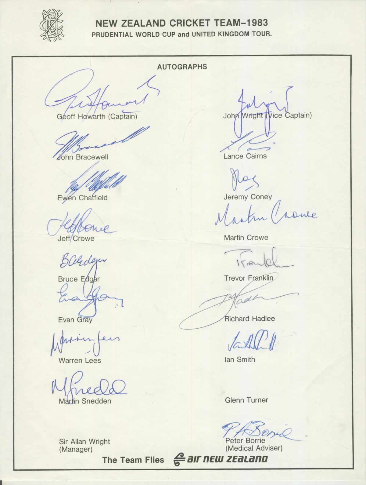 Official autograph sheet for the 1983 New Zealand cricket tour to the UK, including the World Cup. Signed by 16 players and staff - missing the manager and Glenn Turner, who returned home straight after the World Cup and so did not play the Test matches.