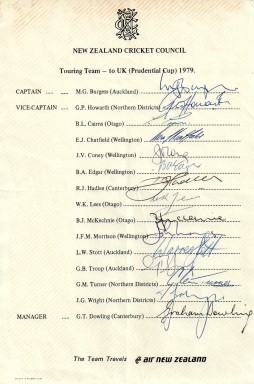 Official team sheet for the New Zealand side that played the 1979 Prudential World Cup. Fully signed, including Hadlee, Burgess, Cairns, Edgar, Chatfield, Howarth, Turner, Wright and Coney.