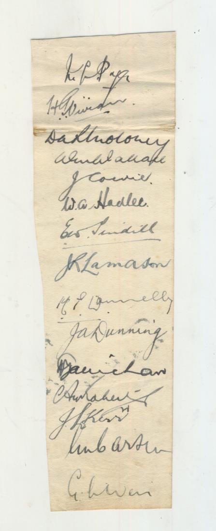 Trimmed piece, signed in ink by 15 members of the tour party to England - JL Kerr, AW Roberts, JR Lamason, DAR Moloney, GL Weir, EW Tindall, MW Wallace, N Gallichan, J Cowie, WN Carson, WA Hadlee, HG Vivian, ML Page, MP Donnelly and JA Dunning. Not signed by TC Lowry.