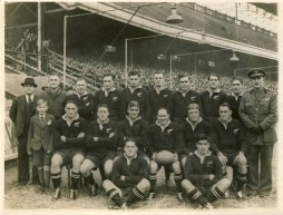 Press photograph of the New Zealand Army XV that defeated Cardiff 3-0 at Cardiff Arms Park on Boxing Day 1945. The ground had still not fully recovered from the bomb damage inflicted in 1941.