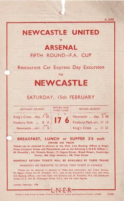 LNER Railway handbill advertising a Restaurant Car Express Day Excursion from King's Cross to Newcastle, stopping at Finsbury Park to coincide with the FA Cup 5th round match between Newcastle Utd. and Arsenal on 15th February 1936.