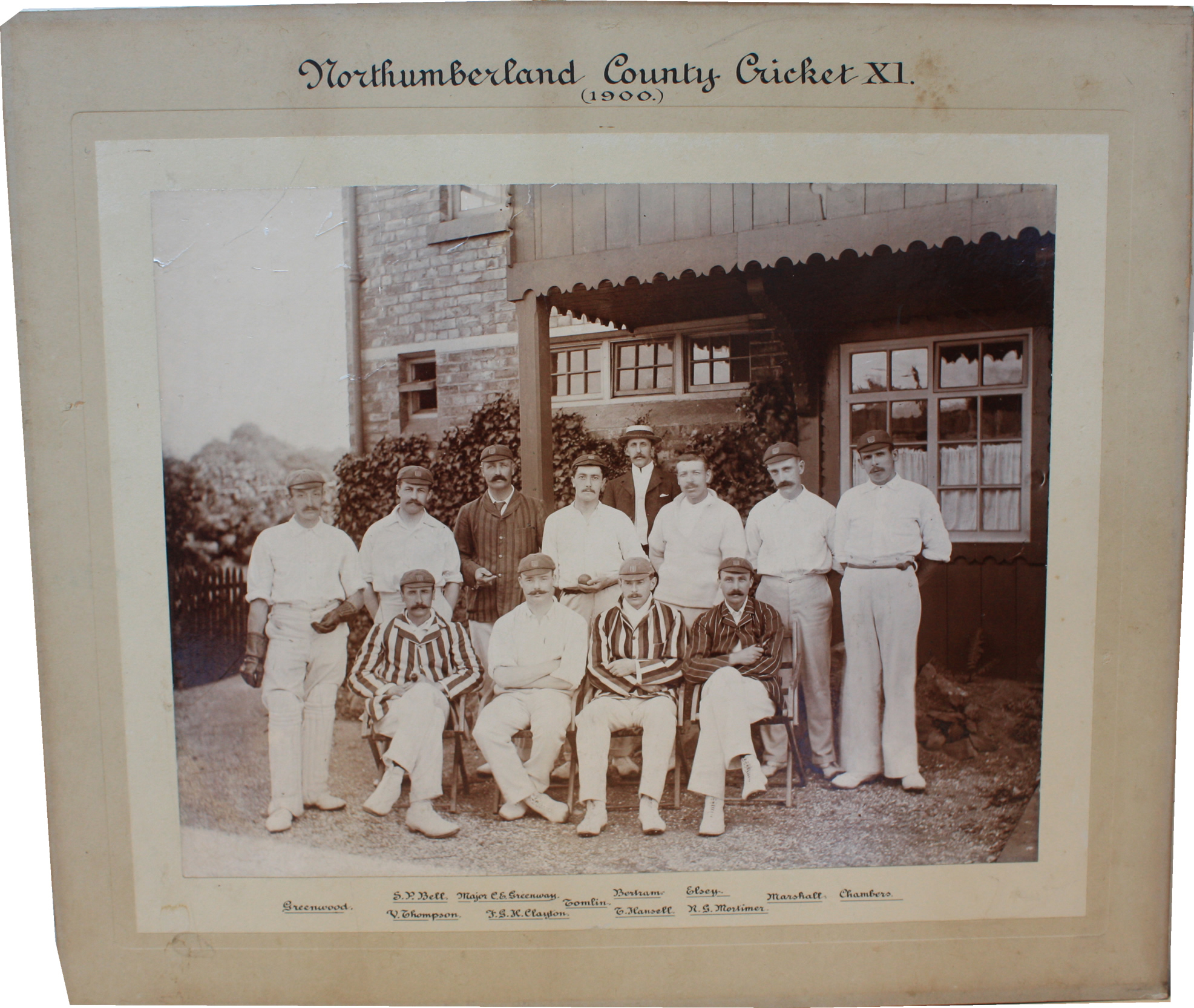 Original cricket photograph of a Northumberland County XI from 1900. Includes Lord Greenwood, Bell, Thompson, Clayton, Tomlin, Berham, Hansell, Elsey, Marshall, Major Greenway (also of Somerset), Chambers (Notts) and Ralph Mortimer (Lancs).