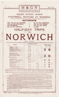 Midland & Great Northern Joint Railway handbill advertising half day trips from Kings Lynn and intermediate stations to Norwich to coincide with Norwich's Second Division home matches in the 1936/7 season.