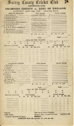 Oval, Sept 14 - 18, 1929. Rest of England won by 8 runs. In one of the best ever matches between the Champion County and the Rest, the bowling of Robins (6 for 89 and 9 wickets in the match) secured a narrow victory. Woolley made a hundred for the Rest - Sandham, Wyatt, Hobbs and Leyland hit fifties.