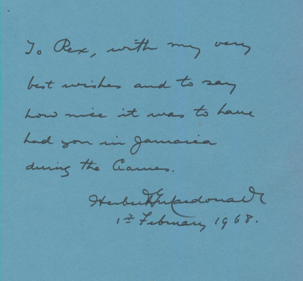 1st edition, small folio. 272pp. including black and white and full colour photos and illustrations, tables of results etc. Internally very good, clean and bright. In the original deep blue leatherette. Long dedication from Sir Herbert MacDonald (the compiler) to Rex Alston, the leading sports commentator - dated February 1st 1968.