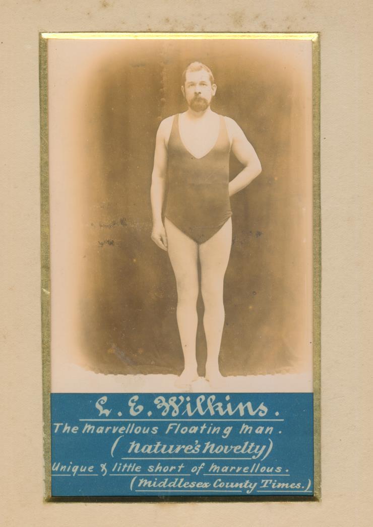 Original carte de visite photograph of L.E. Wilkins, who was described by the Middlesex County Times as "The Marvellous Floating Man (nature's novelty)". Wilkins is seen standing in his swimsuit. The photograph is probably from the late 19th century. The Middlesex County Times covered the Ealing and Northolt areas of north-west London.