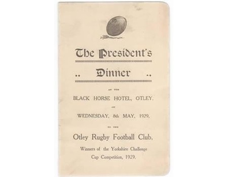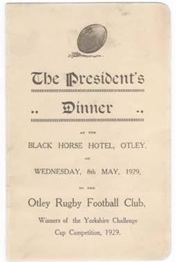 Menu card for the Otley RFC President's Dinner at the Black Horse Hotel, Otley, on 8 May 1929, in honour of winning the Yorkshire Challenge Cup 1929.