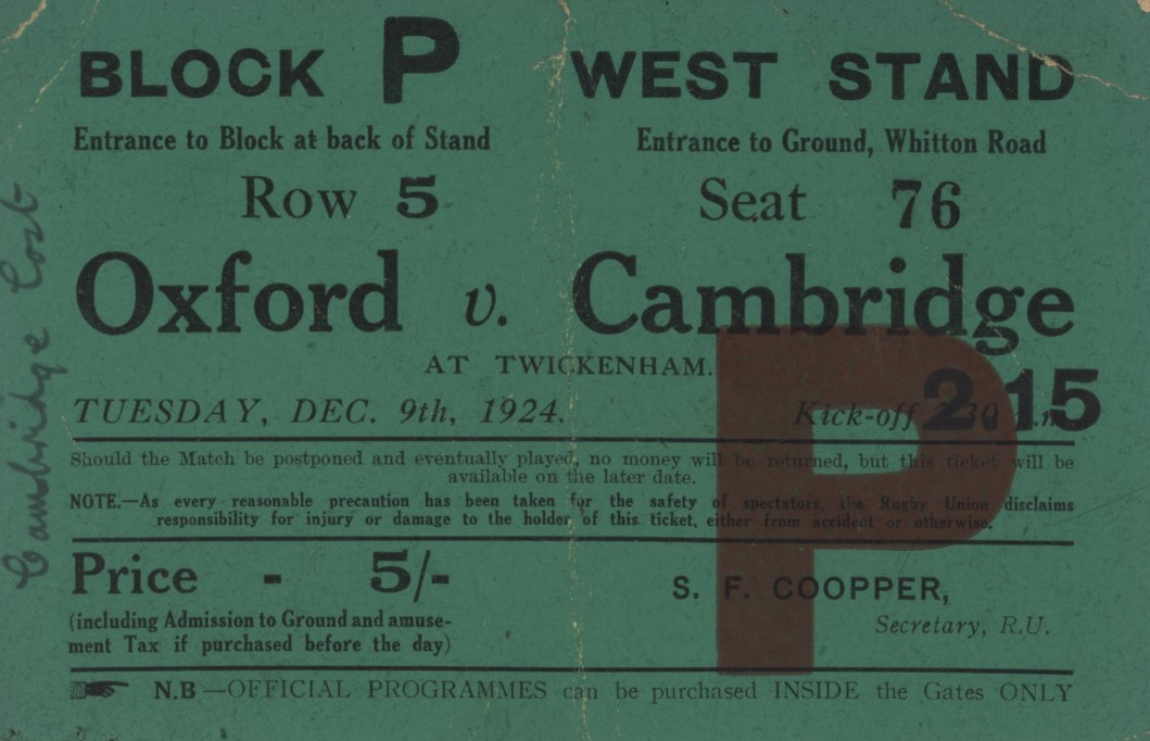 Original ticket for the 1924 Varsity Match, held at Twickenham on December 9th, 1924. Oxford won the match 11-6.