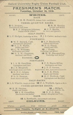 Team sheet printed on card showing the players and positions for the Freshmen's match between Whites and Colours at Oxford University on October 14 1919.