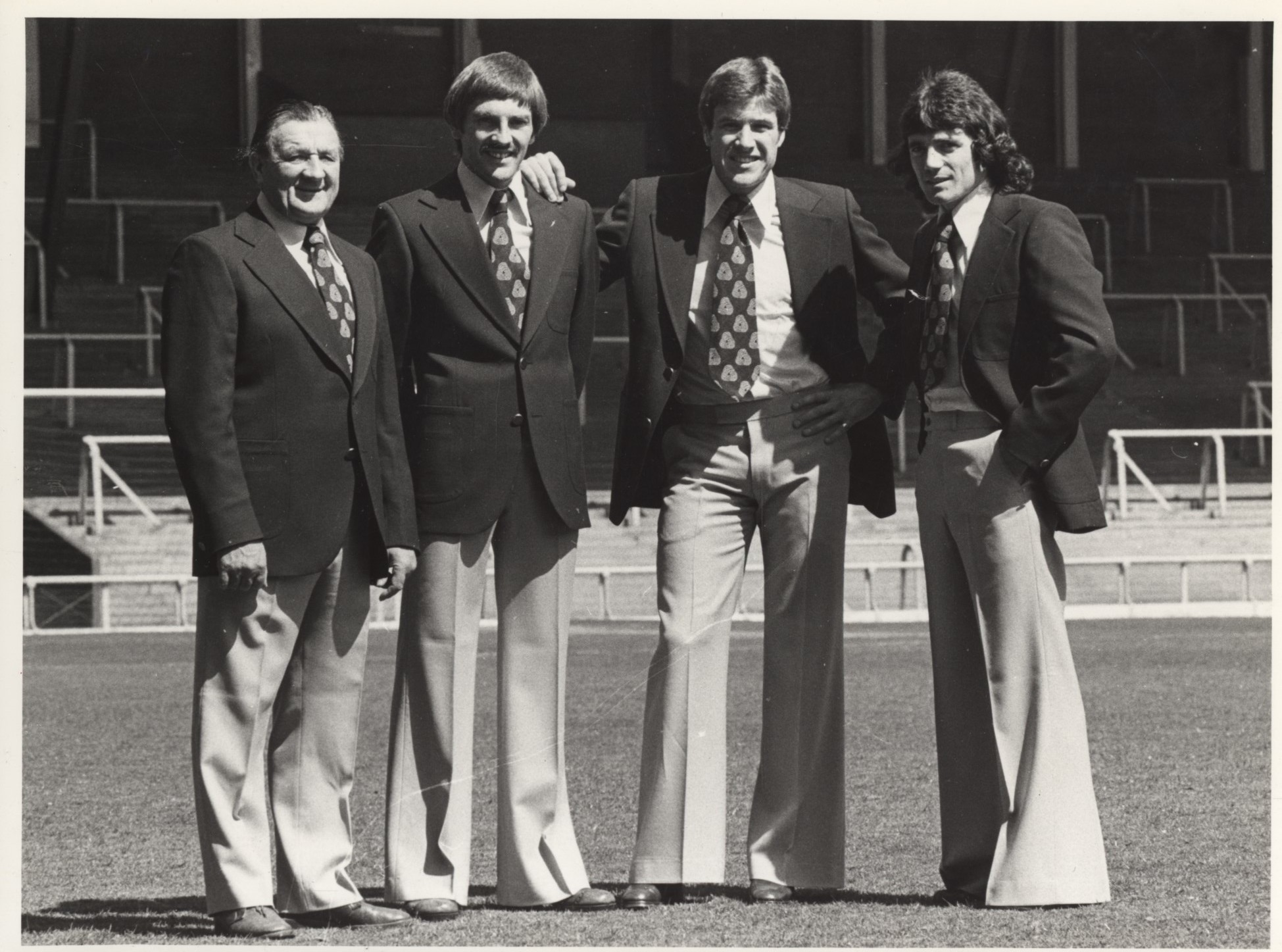 Original photograph of Bob Paisley, Steve Heighway, Emlyn Hughes and Kevin Keegan posing in blazers and flares, obviously during the 1970s.