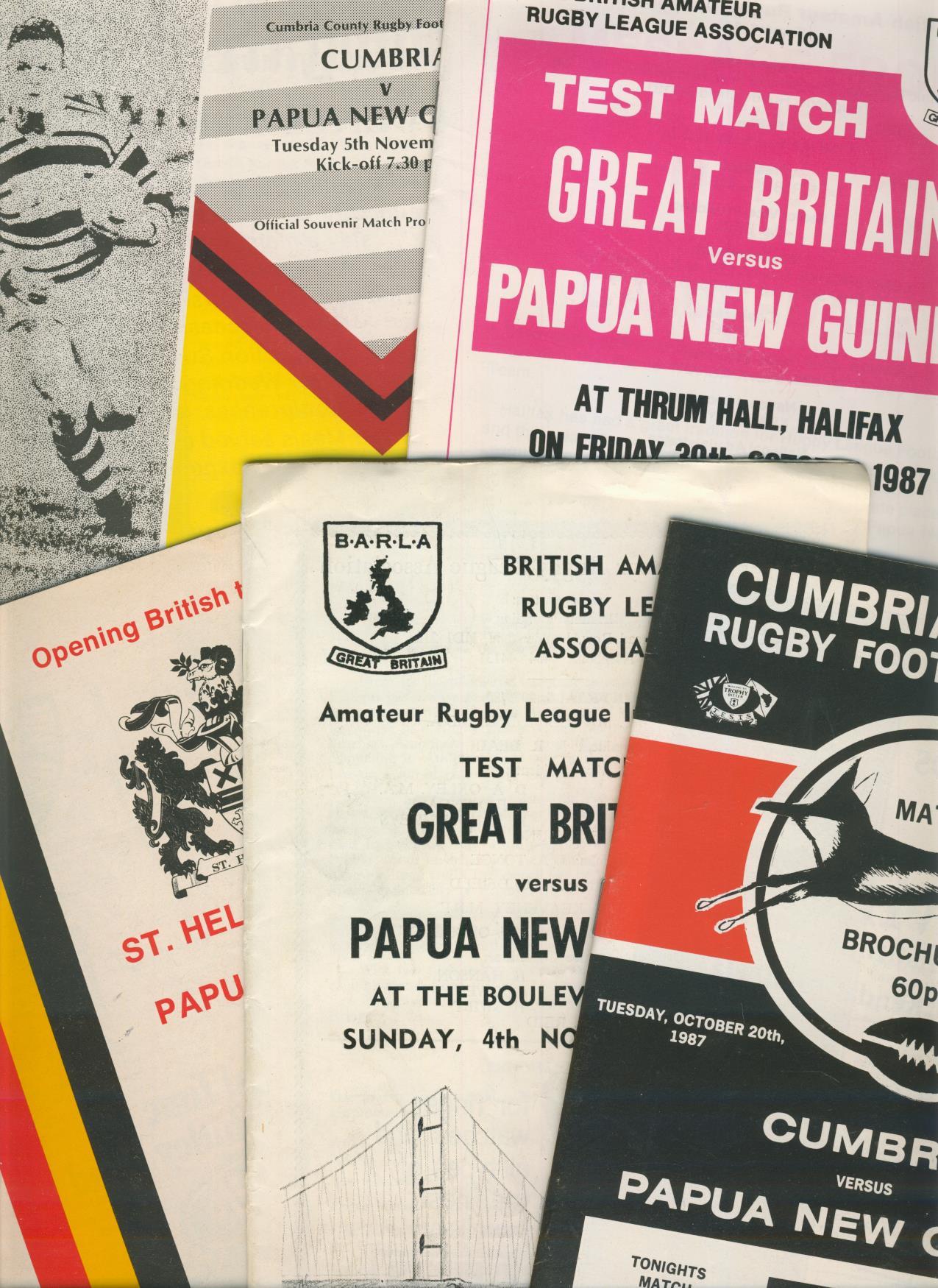 Five official programmes for matches played by Papua New Guinea in England - v St. Helens (October 31st, 1979); v Great Britain (November 4th, 1979); v Cumbria (October 20th, 1987); v Great Britain (October 30th, 1987); v Cumbria (November 5th, 1991).