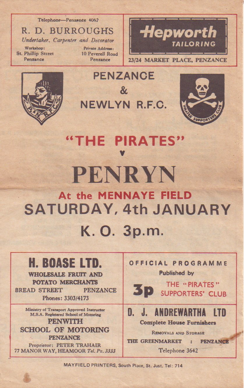 Official match day programme from the Cornish Derby between "The Pirates" and Penryn, played at the Mennaye Field on the 4th of January 1975.