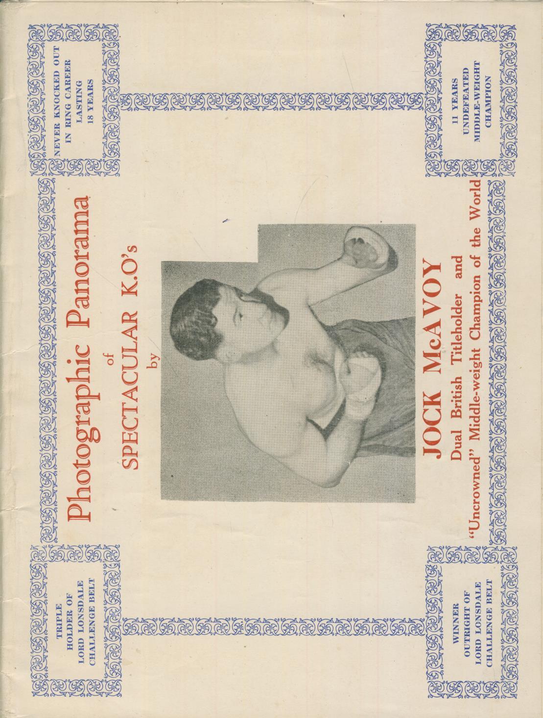 Souvenir brochure celebrating McAvoy's knock-downs, of which there were many. Jock McAvoy (1908-71) was known as the "Rochdale Thunderbolt" having hailed from the Lancashire town and Joseph Tolley's famous boxing stable. In the 1930s he held the British and Commonwealth middleweight titles. Later in his career, he fought and lost several heavyweight bouts against such notables as Freddie Mills and Jack Petersen. From 132 wins, he scored 82 knockouts. He lost 14 times with one draw and was never knocked out in a ring career lasting 18 years. Ring Magazine rated him one of their 100 great punchers of all time.