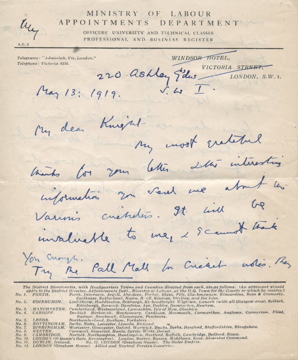 Handwritten letter in ink on two sheets of headed notepaper from the Ministry of Labour Appointments Dept., dated May 13th 1919. Warner replies to a letter from the Surrey and England cricketer,  D.J. Knight. Warner proposes that Knight put himself forward to be master in charge of cricket at Harrow school. "If you would care for the job I would recommend you strongly."