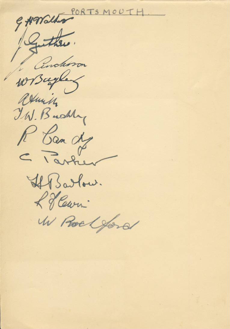 Album page. Signed in ink by 11 Portsmouth players, probably during the 1939-40 season. The players are Walker, Guthrie, Anderson, Bagley, Smith, Bushby, Candy, Parker, Barlow, Flewin and Rochford.