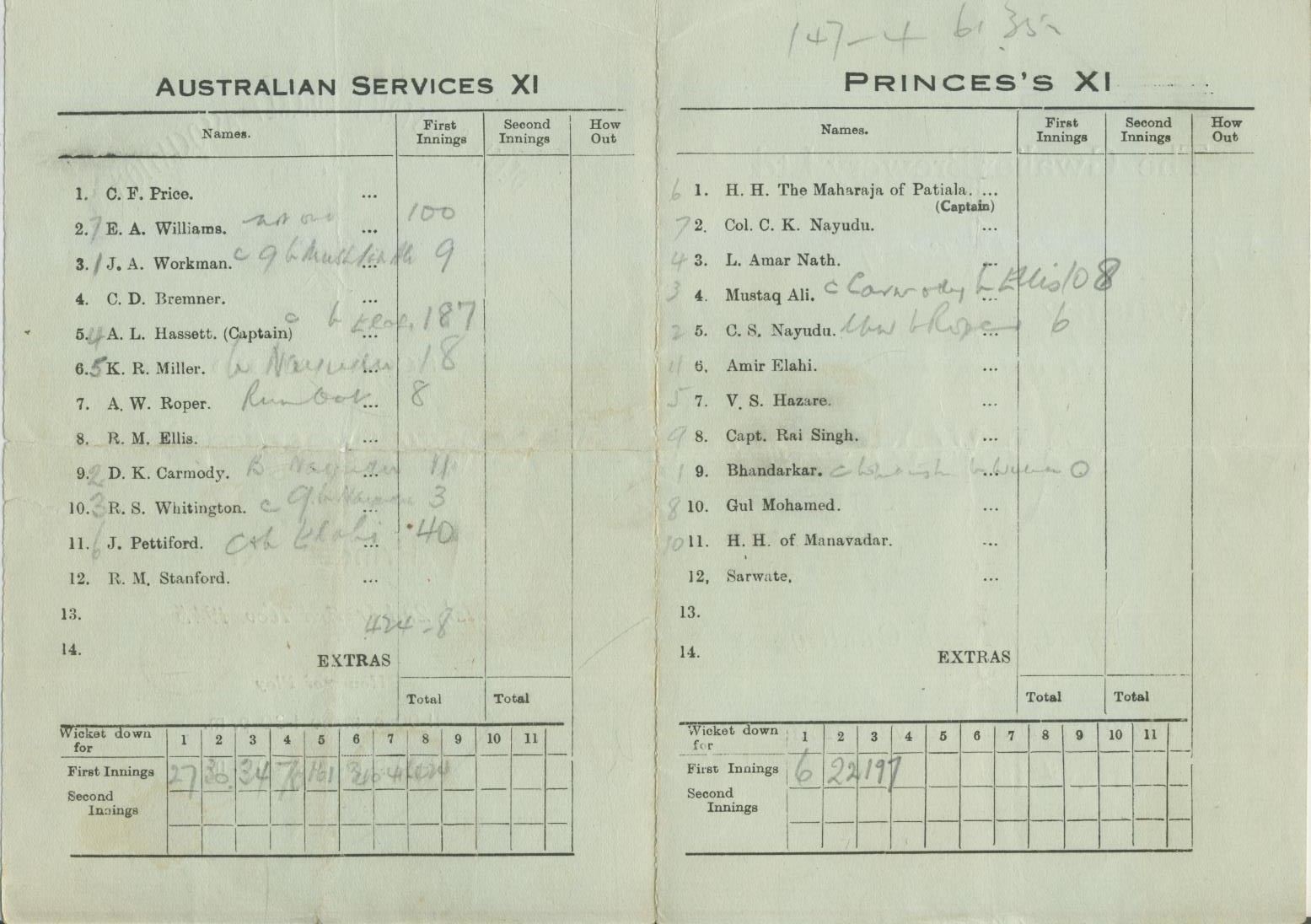 Cricket » Cricket Scorecards » Overseas » PRINCES XI V AUSTRALIAN SERVICES XI (DELHI) 1945 CRICKET SCORECARD