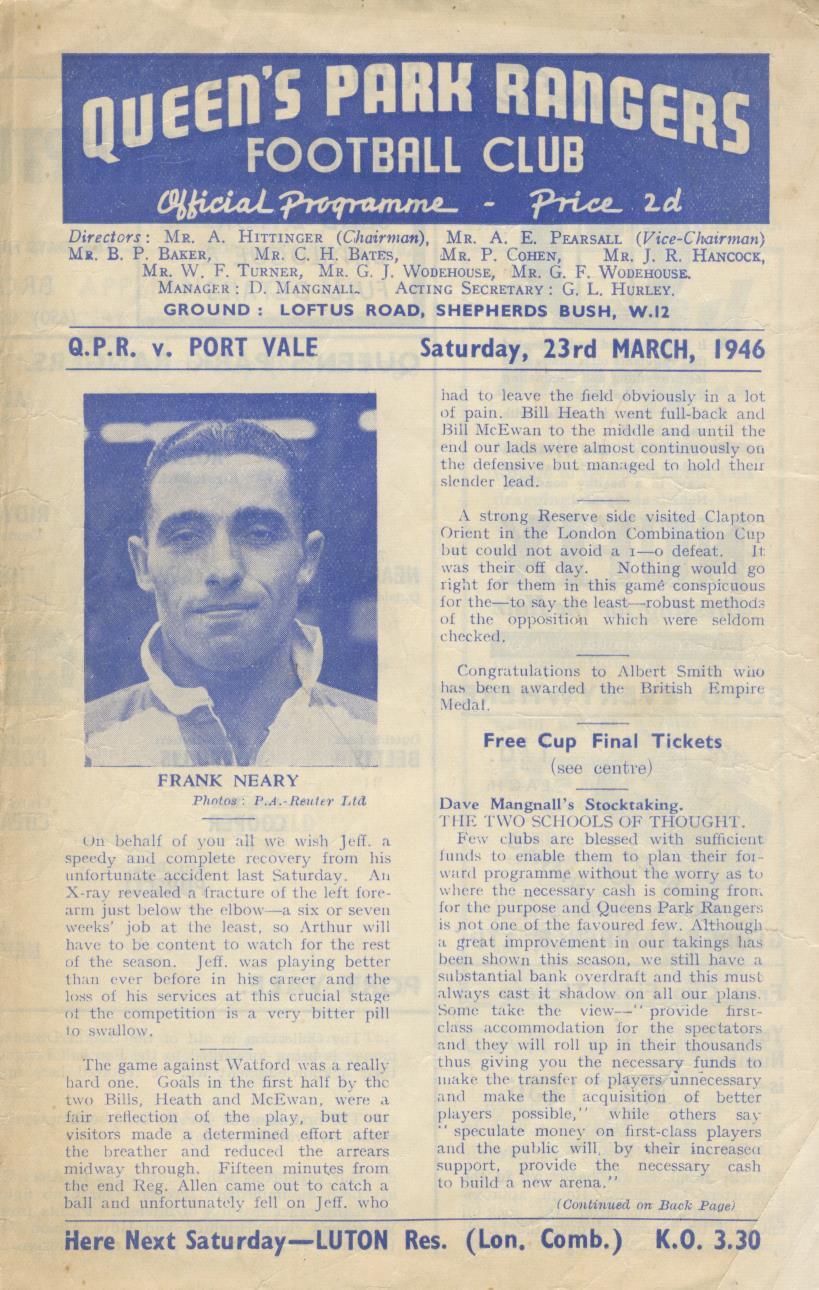 QUEEN'S PARK RANGERS V PORT VALE 1945-46 FOOTBALL PROGRAMME