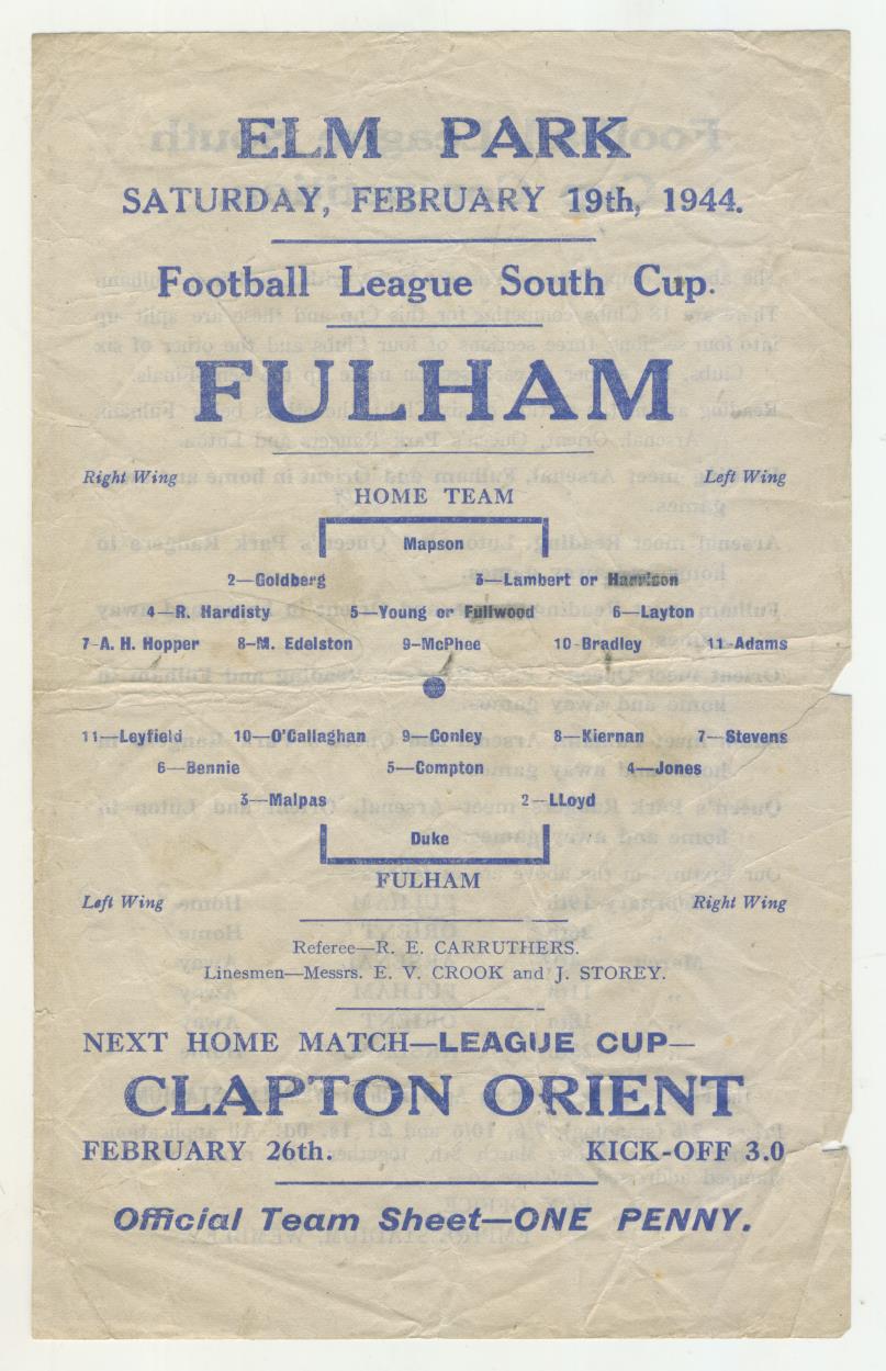 Official programme for the Football lLague South Cup match, played at Elm Park on February 19th 1944.