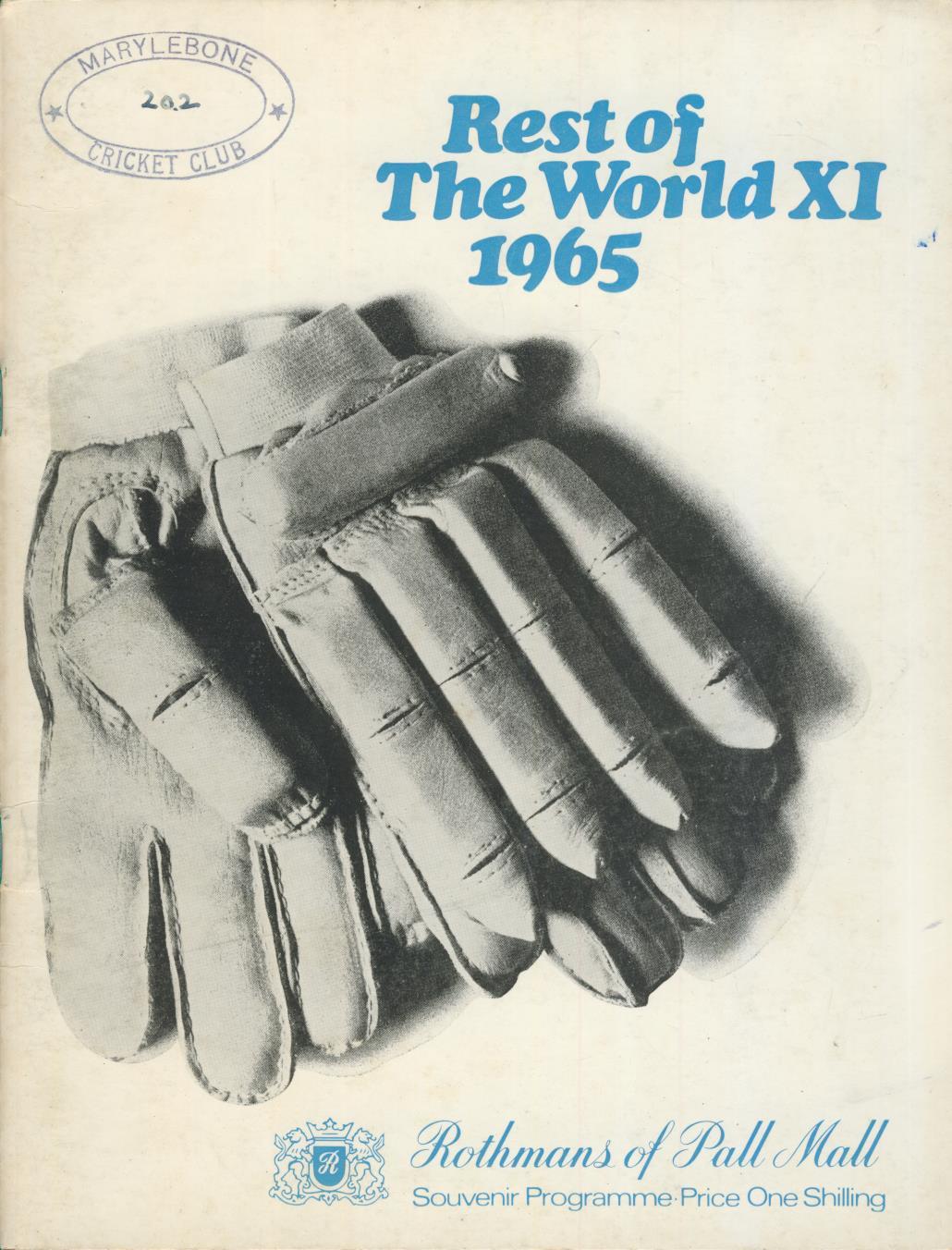 Programme for the series of matches played by the Rothmans Rest of the World Xl in 1965. From the MCC Collection with stamp to front cover.