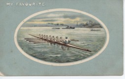 Rowing postcard. Illustration of a rowing eight with the legend "MY FAVOURITE" by W&A of London, circa 1907. Postally used and stamped 1907, with handwritten message in ink on reverse. Minor damage to bottom left corner. In good condition.