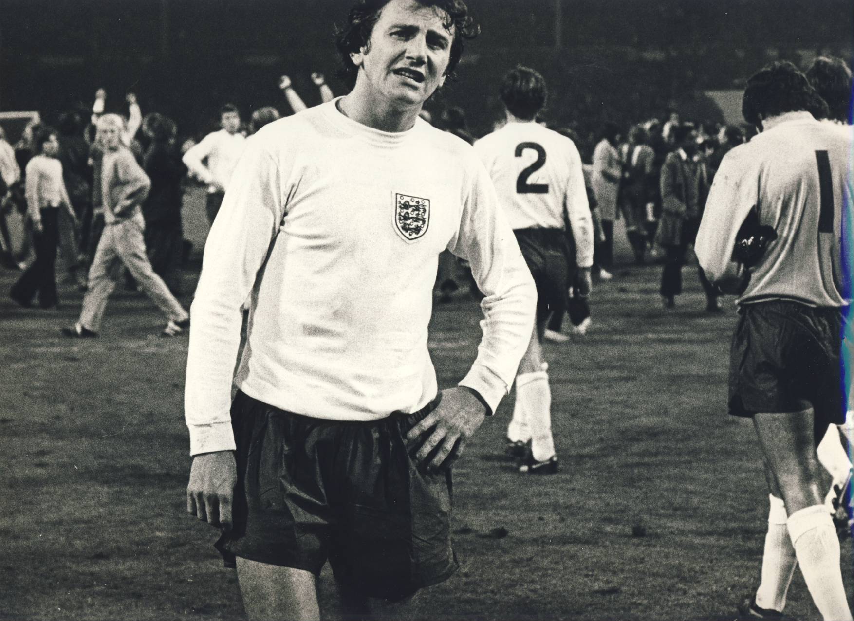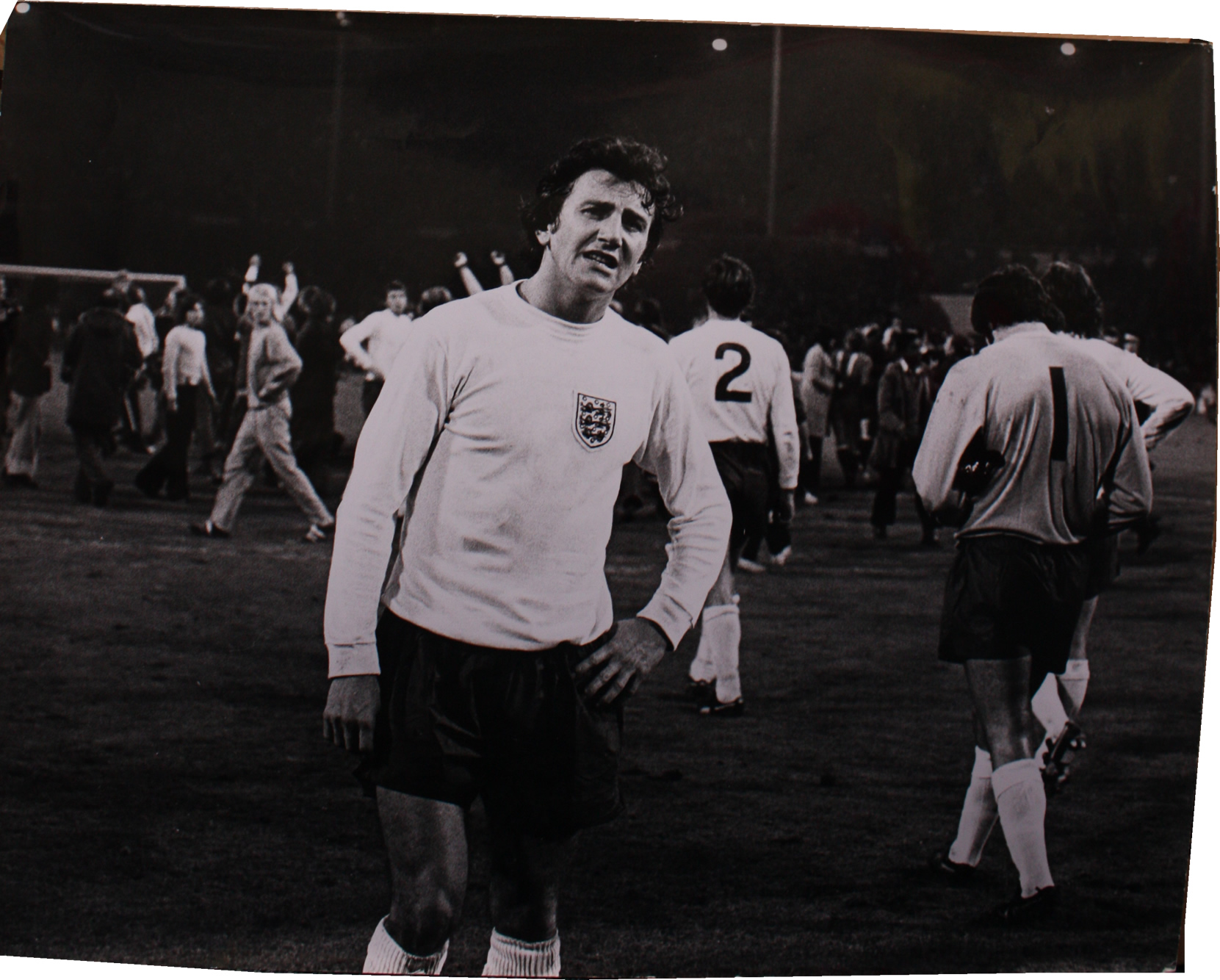 Original Press photograph from the World Cup Qualifier (for 1974 World Cup) against Poland at Wembley. England neeeded to win the match to qualify, but were held to a 1-1 draw. Here Roy McFarland shows his disappointment after the match. The photograph was taken by the well-known sports photographer, Don Morley, who has annotated it to the reverse.