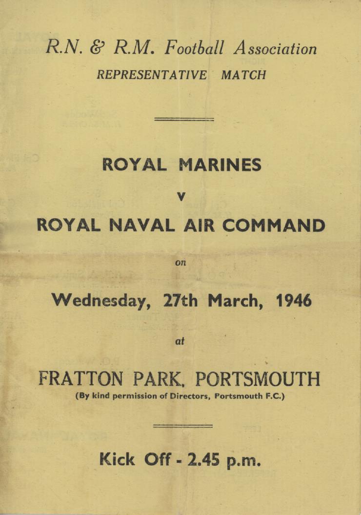 Official football programme for the match played at Fratton Park on 27 March 1946, with Reg Flewin of Portsmouth FC featured as captain of the Royal Marines side.