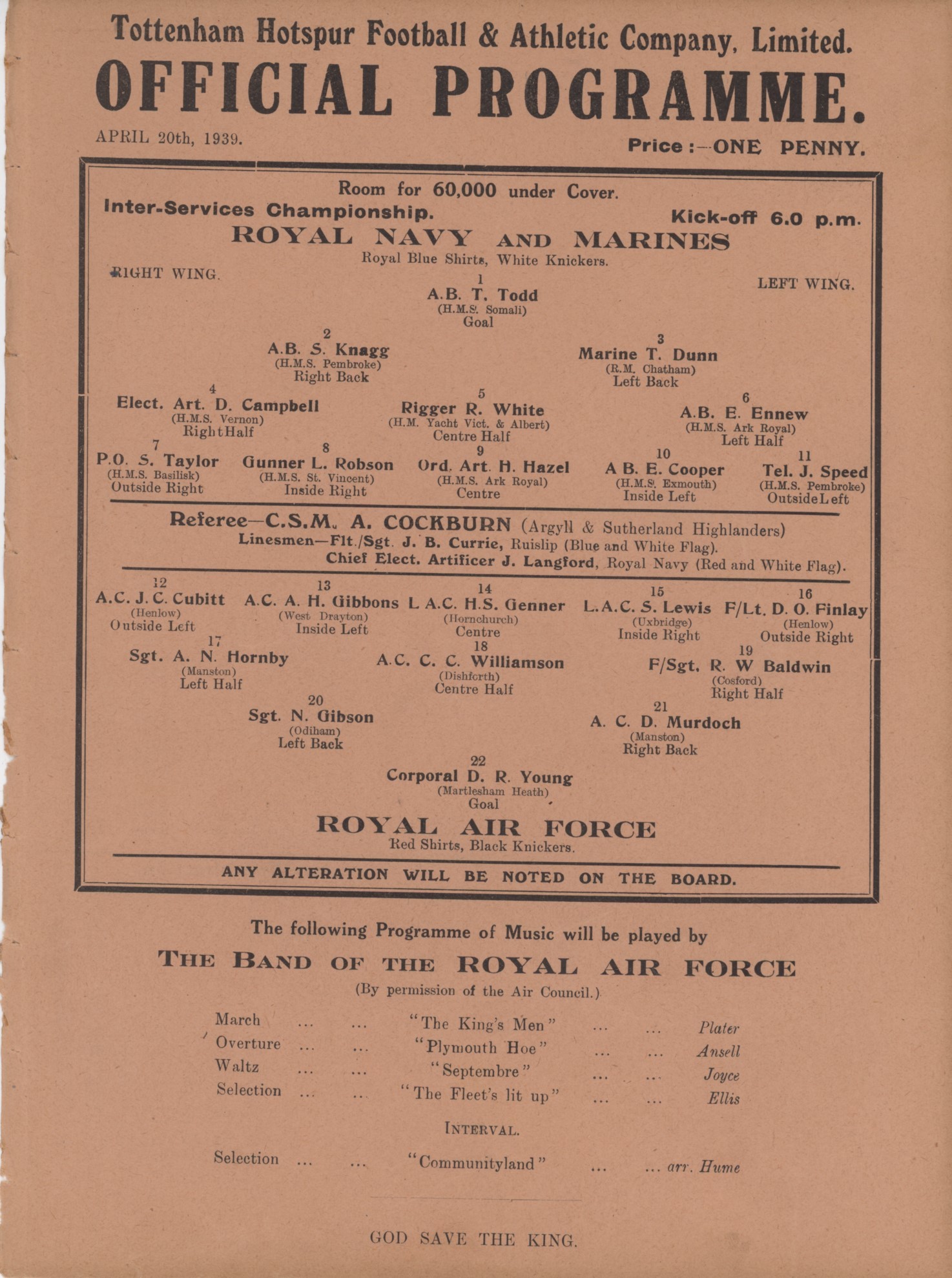 Official programme for the match played at White Hart Lane on April 20th, 1939.