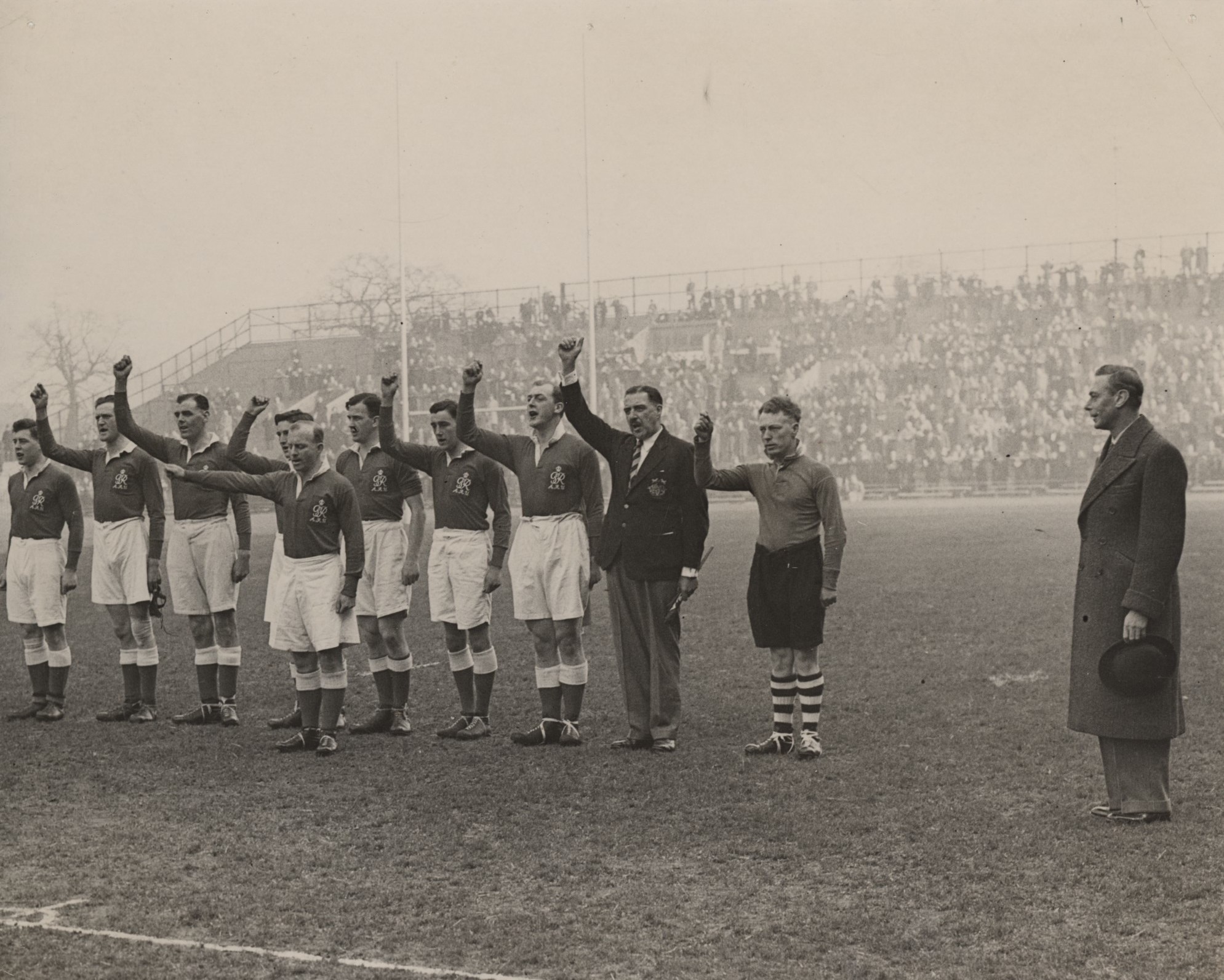 Original Press photograph of the Army players giving three cheers to the King, who is watching on. The match was played at Twickenham on March 6th, 1948.
