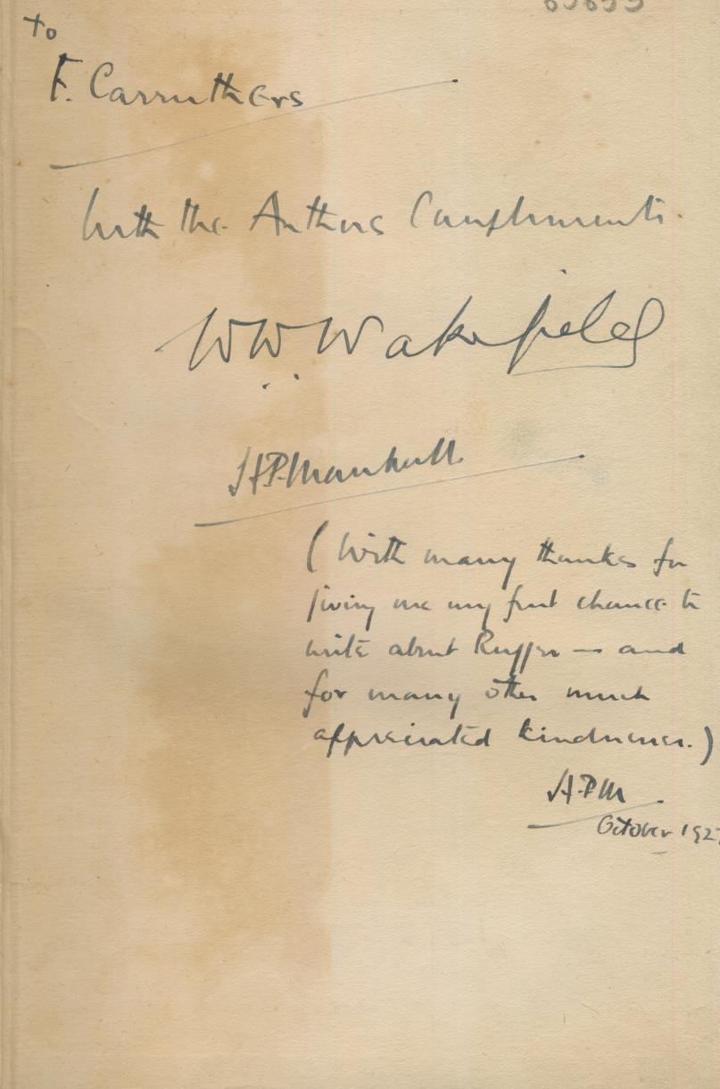 First Edition. xi+ [1] + 490pp. + [1]. Frontispiece (England XV 1923-24), 3 further plates, text illustrations and diagrams. Some foxing to page edges and a few small ink marks to top of page block. Green cloth boards with original dust-wrapper, lightly rubbed and foxed with chips to head of spine and some edges. Signed to fly-leaf by both authors with a dedication to F. Carruthers - a further note from Marshall states "With many thanks for giving me my first chance to write about Rugger - and for many other much appreciated kindnesses". A rare signed copy in dust-wrapper.