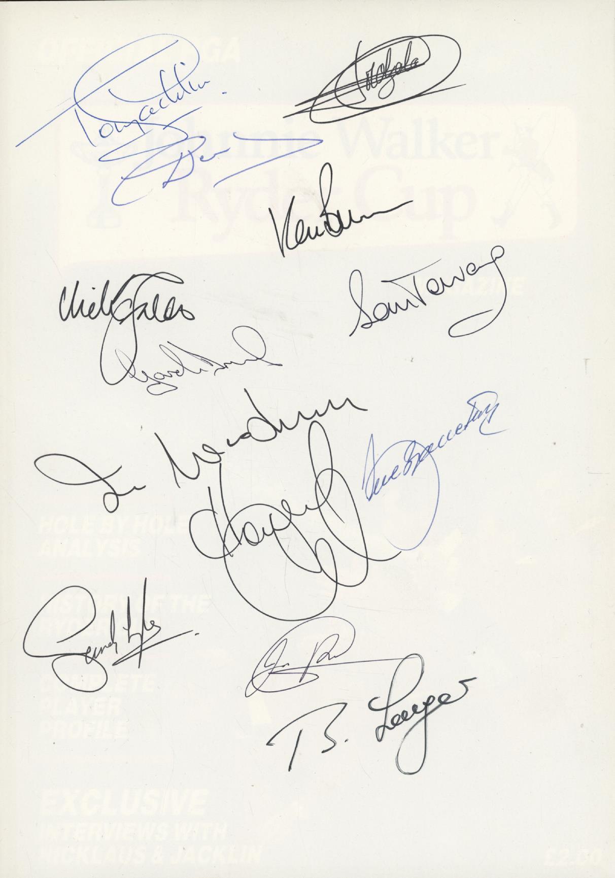Paperback. Large format. 152pp. Bound in official faux leather boards with gilt titles. The binding is a little loose. Signed to fly-leaf by the full European team - Jacklin, Ballesteros, Faldo, Woosnam, Lyle, Langer, Torrance, Olazabal, Brand, Darcy, Rivero, Clark and Brown. Very good condition.