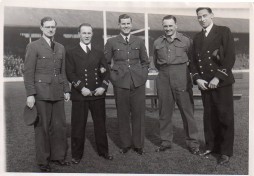 Original Press rugby photograph of the Sale RFC English internationals of the 1940s - S/Ldr J. Parsons, Lieut. G. Hollis RN, Cpl. J. Mycock RAF, Capt. E.P. Dunkley RA and S/Lt J.B. Doherty RN in their military uniforms.